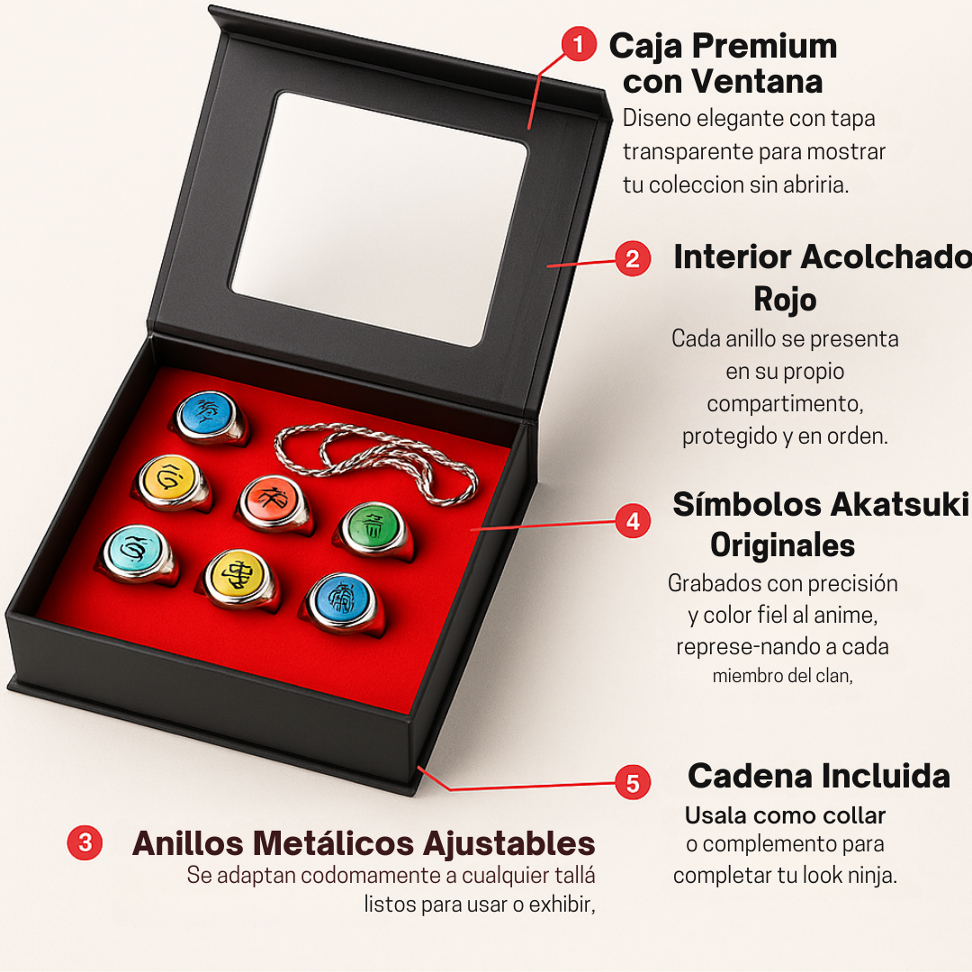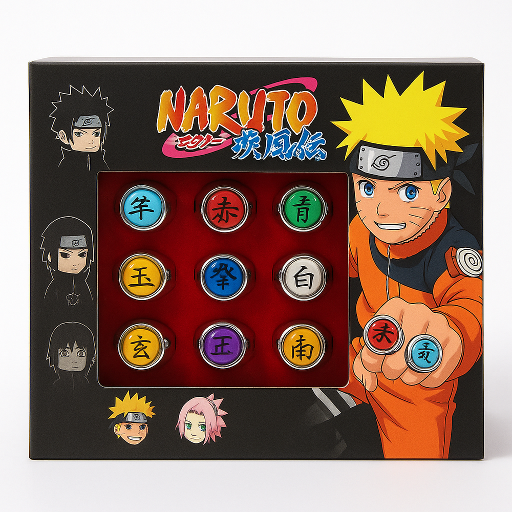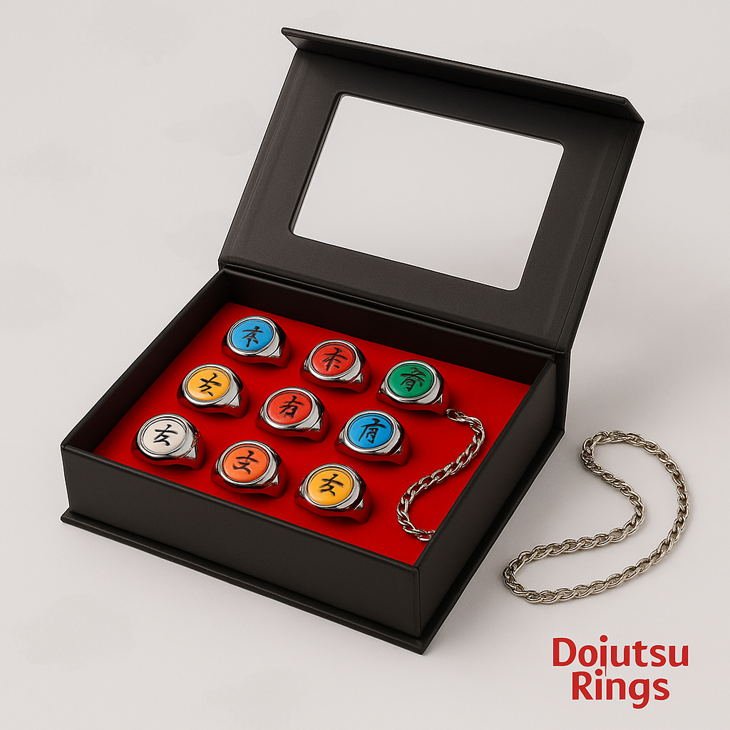 El Set Coleccionista Akatsuki de Dojutsu Rings es una pieza única que combina diseño, detalle y pasión por el universo ninja.Descubre por qué miles de fans lo consideran un símbolo de poder, unión y legado.